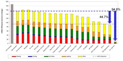The first goal of this project was to achieve a 40% savings relative to the Building America Benchmark. The mild climate of the San Francisco Bay Area and the townhome floor plan, made it difficult to reach high savings. All enclosure upgrades only achieved a 14% savings. These measures included airtightening, duct leakage reductions, low-density spray foam cavity insulation, R-5 rigid foam sheathing on exterior walls, and triple glazed windows. The addition of improved HVAC (16 SEER/9.5 HSPF air source heat pump) only increased the total savings to 18%.